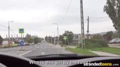 Uma loira sexy e peituda vai pedir carona. Ela tem uma boca grande perfeita para engolir um pau inteiro e faz isso enqunato ele dirige, e depois é fodida!