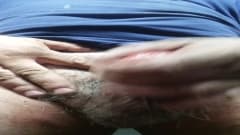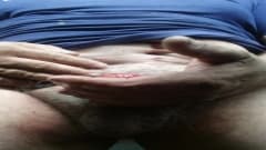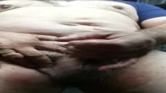 Homem gordo batendo punheta na frente