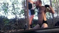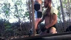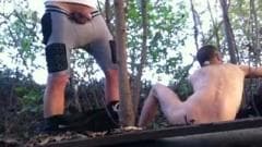Dois caras aproveitando seus paus juntos ao ar livre onde um suga o outro e ficam cada vez mais duros!
