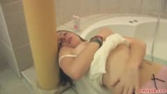 Sozinha no banheiro, na banheira, ela se toca e se molha ainda de vestido, que fica transparente. Então ela fica só de calcinha e passa óleo pelo corpo!
