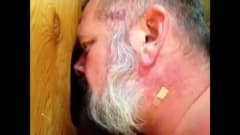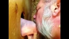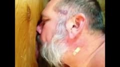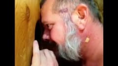 Este velho adora fetiches com outros homens, através de um buraco, através do qual ele beija suas bocas e chupa seus pénis.