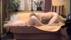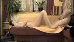 Esta morena faz seu homem dançar duro para ele em lingerie sexy que gradualmente decola para a provar saborosa no sofá.