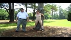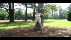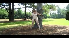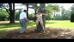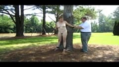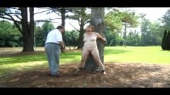 Este casal maduro gosta de fazer coisas perversas e diferentes. Hoje a mulher está amarrada a uma árvore e recebe chicotadas de seu amante gordo.