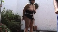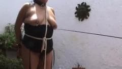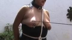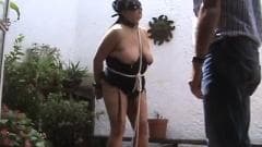 Ela é uma milf madura, amarrada e vendada, enquanto esse tio chicoteia seus peitos. Divirta-se e assista-os.