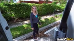 Ela precisava de dinheiro e conseguiu ganhar $ 420 por entrar na van desse estranho para se masturbar e também ser fodida como uma cadela.