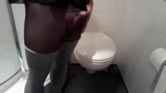 Esse cara gay adora usar meia-calça para se masturbar com elas e faz isso até gozar em si mesmo. Ele se masturba no banheiro!