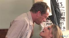Ela começa a chupar o pau do cara e depois oferece a ele sua buceta depilada e seus peitos grandes que se movem em todas as direções.