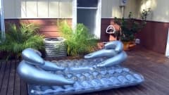 Este casal comprou uma cama insuflável para poder foder confortavelmente ao ar livre. Eles ficam nus e começam a gozar de sexo pouco a pouco