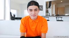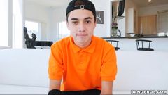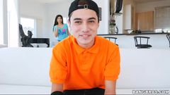 Um jovem bastante passivo recebe uma garganta profunda e é fodido por uma morena. 69, buceta peluda e gozada facial!