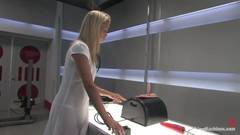 A loira bonita com mamas pequenas pode provar que esta máquina de foder está apenas funcionando corretamente. Sua buceta está pingando!