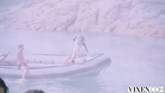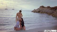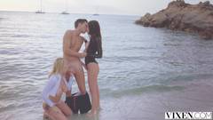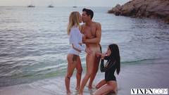 Duas garotas lindas e safadas vão para uma praia deserta com um belo rapaz. As duas vão chupá-lo, e se beijam enquanto uma é chupada e a outra trepa no pau