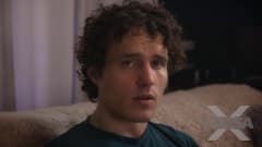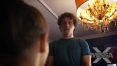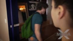 Mulher morena está prestes a se tocar na beira da escada antes que um homem chegue e foda sua buceta sem pressão