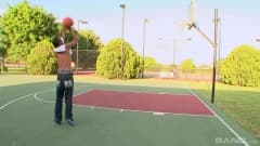 Dois homens negros, um deles uma mulher com peitos grandes, vão fazer sexo em uma quadra de basquete - um momento excitante.