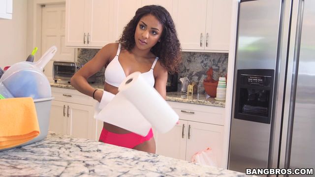 Uma mulher mestiça muito bonita com um corpo fantástico limpa um apartamento para depois ser esmagada por seu chefe empregador