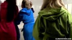 Gostosas brincam no chuveiro enquanto dotado assiste pela porta, ao descobrirem safadas fodem com o rapaz até fazer ele gozar.
