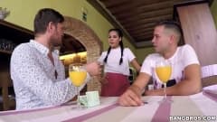 Dois homens ficarão muito animados com a garçonete neste bar que é jovem e tem o corpo perfeito para sexo. Será um trio fantástico para assistir