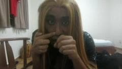 Um cara vestido com uma peruca horrível se fode na bunda. Ele sente tanto prazer que parece possuído. Assista