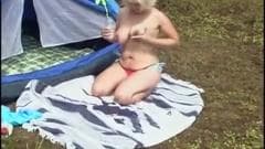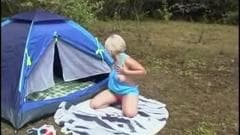 Ela foi para o acampamento e de manhã ela acordou dentro de sua tenda querendo se masturbar. Ele faz isso ao ar livre com prazer.