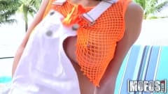 Uma morena se acaricia através das roupas e deixa o cara louco