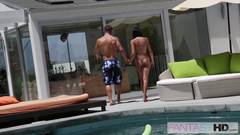 Depois de um bom banho de sol, essa morena safada vai receber um belo pau grande em sua pequena vagina
