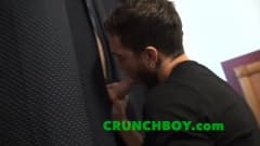 Este homem se esconde atrás da cortina e puxa seu pênis ereto para que seu amigo consiga chupar sem parar. Então eles têm tempo para foder.