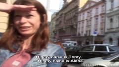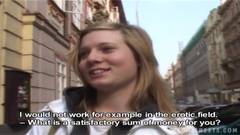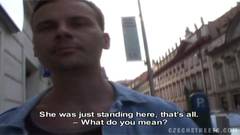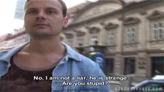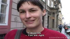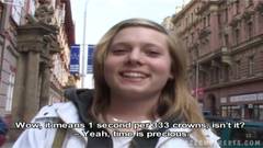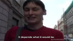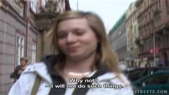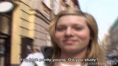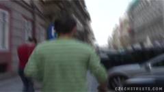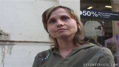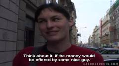 Após algumas recusas, uma garota concorda em dar sexo oral a um estranho na rua e na frente da câmera por um punhado de notas.