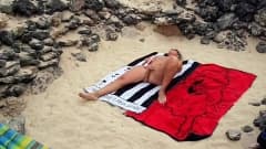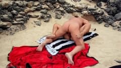 Este casal escolheu uma praia em Fuerteventura para ir foder, pois sempre sonhou em fazê-lo ao ar livre. Ela começa a se masturbar.