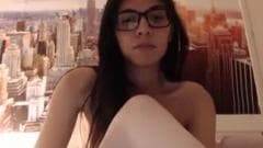 Este doce travesti está se divertindo, enquanto leva seu pau muito duro, e se masturba na frente da câmera com sua meia-calça branca sexy.