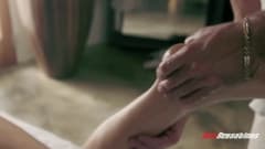 Massagem sensual excitante feita para a gostosa dar a buceta, ela goza na massagem e senta gostoso na rola até ganhar leitada.