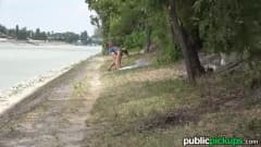 A vagabunda se acomoda perto de um rio e o cara que a observava oferece dinheiro para ela dar uma chupada. Ela gosta do pau dele e mete na sua boceta!