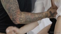 Esse cara com tatuagens, vai curtir quando estiver na cama com a transexual de seus sonhos. Ela é uma mulher peituda que vai cativá-lo com sua bunda.
