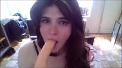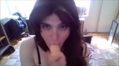 Este jovem travesti de seios pequenos adora chupar seu grande pênis e faz isso profundamente em sua garganta. E grava enquanto o faz.