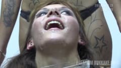 Com o cabelo amarrado para trás e a boca bem aberta, essa vagabunda bebe tudo o que acontece com esses caras gostosos