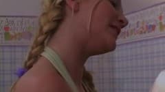 Esta loira é uma verdadeira puta. Depois de voltar da feira, ela espera que sua mãe saia de casa para poder comer o pau de seu namorado.