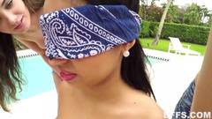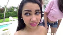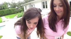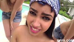 Quando o tempo está tão favorável, eles vão para a piscina e começam a massagear sua amiga mais excitada ao ar livre e a filmam bem de perto.