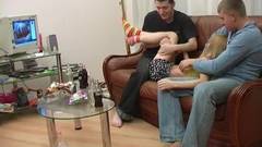 Dois homens decidem provar o ânus e a vagina da jovem loira que, pela primeira vez, irá receber uma dupla penetração.