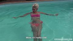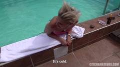 Essa modelo checa loira se diverte muito sendo fodida por esse cara que adora ir à dura na sua buceta a beira da piscina