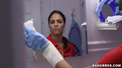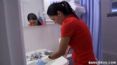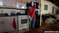A morena Jasmine Caro é uma faxineira extraordinária. Ela chupa o pau de seu chefe e é fodida!