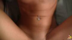 Jovem sexy com peitos pequenos e buceta raspada e apertada recebe uma boa surra de pênis duro e depois goza no rosto