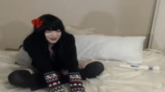 Um jovem travesti gótico masturba seu pau para nós na frente da câmera. Você não pode perder esta cena