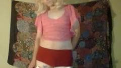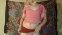 Que cara, com uma peruca loira e meias brancas, exibindo sua bunda grande e feia e brincando com um vibrador.