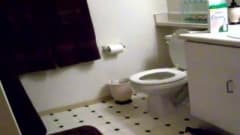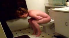 Esta mulher se despe completamente e senta-se no vaso sanitário. Nós a vemos mais tarde com a bunda no ar