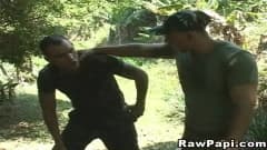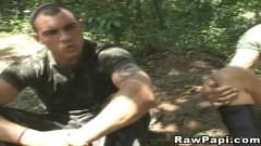 Esses soldados estão no meio da corrida e param para desfrutar de um sexo anal ao ar livre! Eles não têm camisinha, então a foda fica ainda mais gostosa!