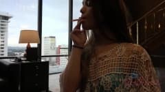 Ela fuma um cigarro e bebe uma taça de champanhe antes de oferecer sua boceta para ser fodida. O cara tira sua calcinha e vê que ela estava bem molhadinha!