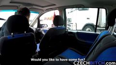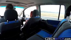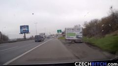 A vadia tcheca é pega na estrada e deixa o motorista tocar sua buceta enquanto dirigem e param para receber o pagamento pela transa
