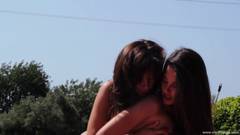 Duas morenas lésbicas se divertindo na piscina