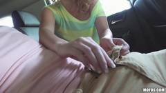 Essa loira é super safada e cheia de tesão, então ela mostra os peitos e chupa o pau do cara no carro, dirigindo por uma avenida.