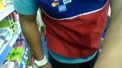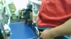 Atrás do balcão da loja o cara baixa as calças e deixa seu pau à disposição de uma morena jovem que lhe dá um boquete de garganta profunda e engole a porra