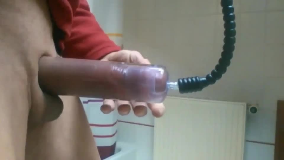 Esse gay está bombeando o pênis com um dispositivo e enfia uma colher de chá dentro do pênis. Isso o excita e o faz gozar.