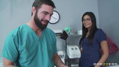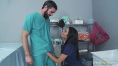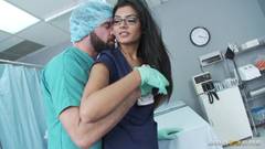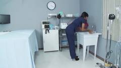 Essa médica morena e gostosa quer agradecer os bons serviços do seu infermeiro pagando um delicioso boquete. Depois ela deita na maca e bate uma siririca!